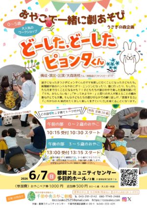 トップ 2024.03.22 入会案内 みる 寄付案内 あそぶ 募集中イベント ~とびっきりの子ども時代を!~ 子ども時代は「今」しかない 集まったみんなといっぱい笑って、ハラハラドキドキな体験あぁ~楽しかった!また行きたい!やってみたい! 舞台鑑賞や遊びをメインにリアルな体験することを大切に、活動しています 募集中イベント 髙木竜馬ピアノリサイタルツアー2026千葉公演 どーした、どーしたピョンタくん【劇あそび】 わすれものの森【舞台劇】 ほっこりハウス 最新の情報はSNS(X、Instagram)をご覧ください XはこちらInstagramはこちら